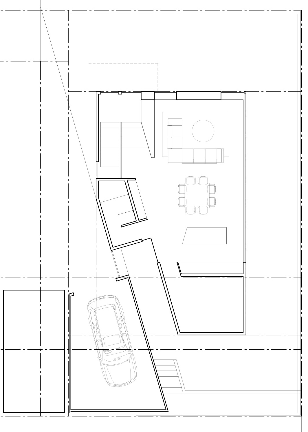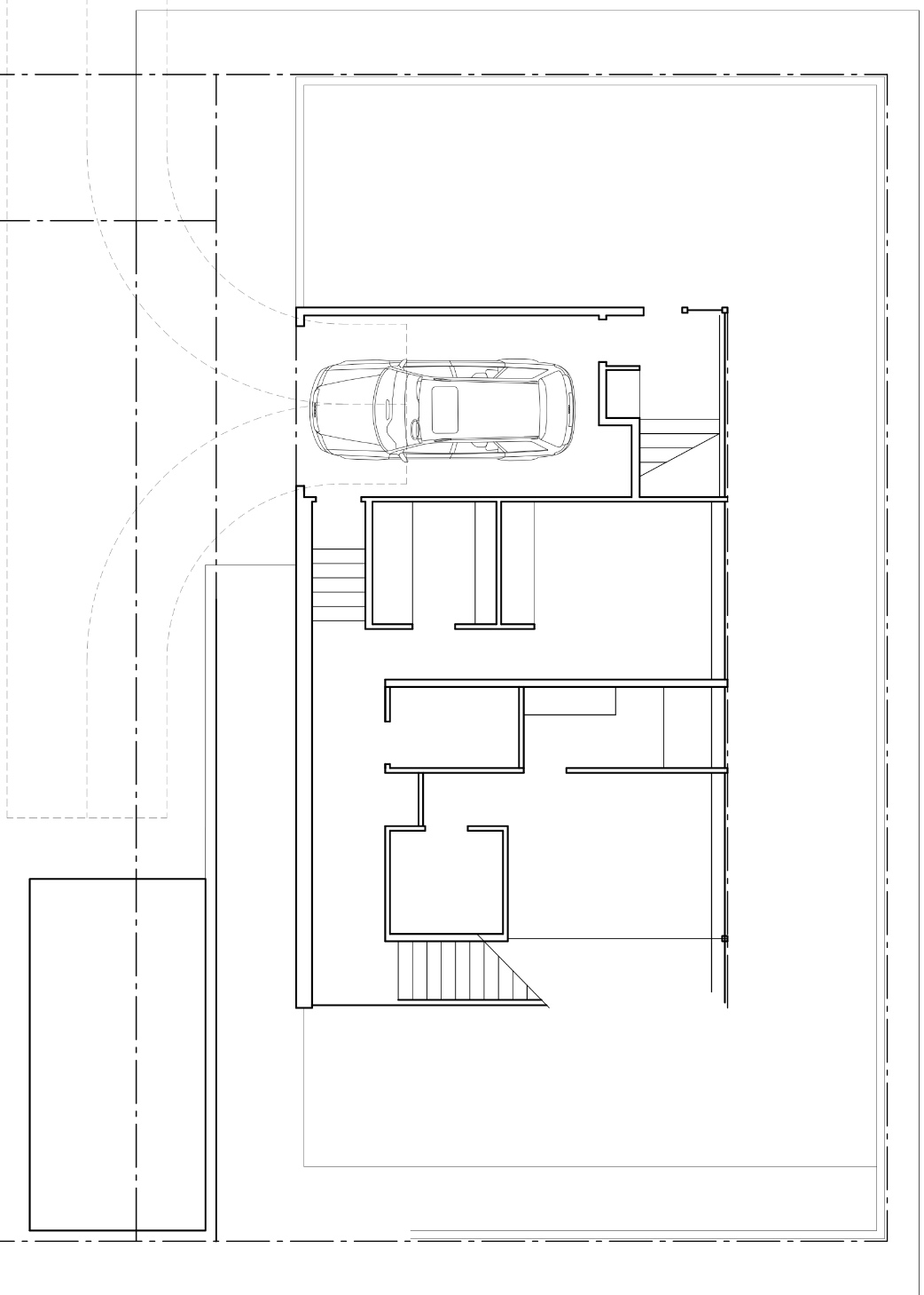 Unlike the prefab designer who had prefab modules and my SketchUp model to work from, the architect started completely from scratch. The first set of options he presented pivoted around the location of the garage. In the plan shown directly below, the garage is in the back of the property. I would use the neighbor’s driveway, for which an easement was granted to my lot by the original owner who subdivided the land. Though this plan would exempt the garage from being counted within the glass box and setback requirements, thereby freeing up more living space within the main structure, it would take up space from the backyard. It would also make the driveway too long. I drive to work on most weekdays and wouldn’t want to back my car all the way out to the street.