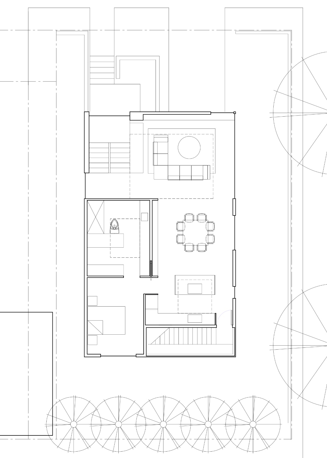 After we settled on the location of the garage, the architect focused on the upper level floor plan, especially on the location of the main bedroom suite (including wardrobe and bath) relative to the main living space and the placement of a stair leading up to the roof (for a possible roof deck). In the first option below, the master suite is set along the west side, with the outdoor staircase to the roof deck along the south wall. Above the living room, kitchen and bath (denoted by the dashed lines) would be “light boxes” with clerestory windows to let lots of natural light in.