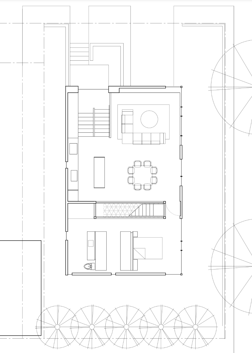 By design, most daily activities (sleeping, cooking, eating, working, etc.) would take place on the upper level. Much of the lower level is an outdoor covered patio open to the yard for hosting barbecues or playing with the dog. One thing I was concerned about is the length of the main living space on the second floor. Is that going to look like a tunnel, especially with the stairs taking up some of the width in the middle? The modular builder’s designer wasn’t willing to share the SketchUp for me to explore on my own.
