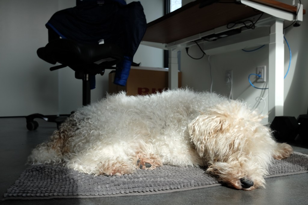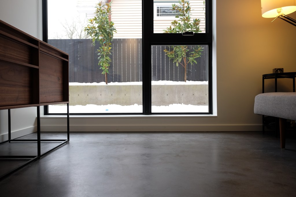 Not counting the laundry-mudroom, where I don’t spend much time, there are two rooms downstairs. One is my office, where I spend weekdays in, plus occasionally weekends too when I’m on my computer. The HVAC keeps it sufficiently warm, though I still need to fully program the smart thermostat. I’m usually in my shoes in there, so I hardly experience the concrete floor directly. My dog does, however, and I’ve noticed that he likes to nap on his shaggy mat when we’re in there. He lays on the concrete from time to time, but usually he’s lounging on his mat. The other room has a sofa bed for guests, a wall-mounted TV, and an accent wall painted in dark navy. I usually end up there at the end of the day, just before bed, catching up on my video streaming with a glass of whisky. It’s so cozy I sometimes end up spending the night on the sofa bed instead of dragging myself to bed upstairs. I call the room the “snug.” My dog also likes to snuggle when we’re in there, though I suspect that has more to do with the TV sometimes freaking him out than with the temperature of the floor.